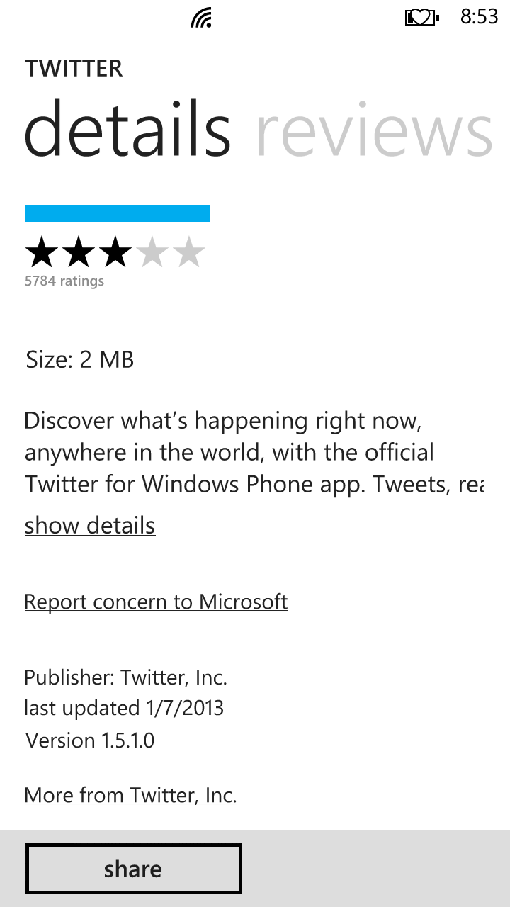 On her phone, the Marketplace says that the current version is 1.5.1.0, released on Jan. 27, 2013; while my phone’s Marketplace says the current version is 2.0.0.1, released on Feb. 26, 2013. I’m not sure exactly what might be going on, but it is rather strange to see this happen, especially on the heels of the Windows Phone 7.8 update getting pulled from the metaphorical shelves yesterday. This is not a good sign for our beloved platform.